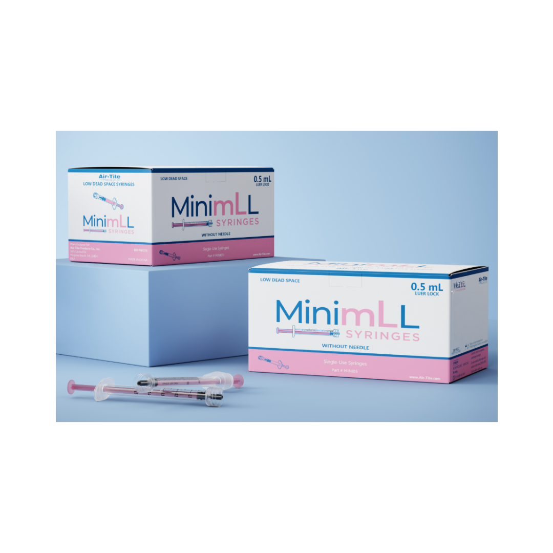 MinimLL® Syringes now available in both the original 0.5mL and 1mL versions. Both are Low Dead Space Luer Lock Syringes. The low dead space (LDS) feature minimizes loss of material, and can be combined with low dead space needles for additional product savings. In addition to helping reduce needle pop-off, the luer lock mechanism allows for the exchange of needle (such as using a large gauge needle for draw-up and a fine gauge for injection). MinimLL® syringe barrels and plungers are manufactured from Polypropylene, which has a long history of use in various medical devices and is considered a safe vessel for most uses; with a polyisoprene rubber tip.