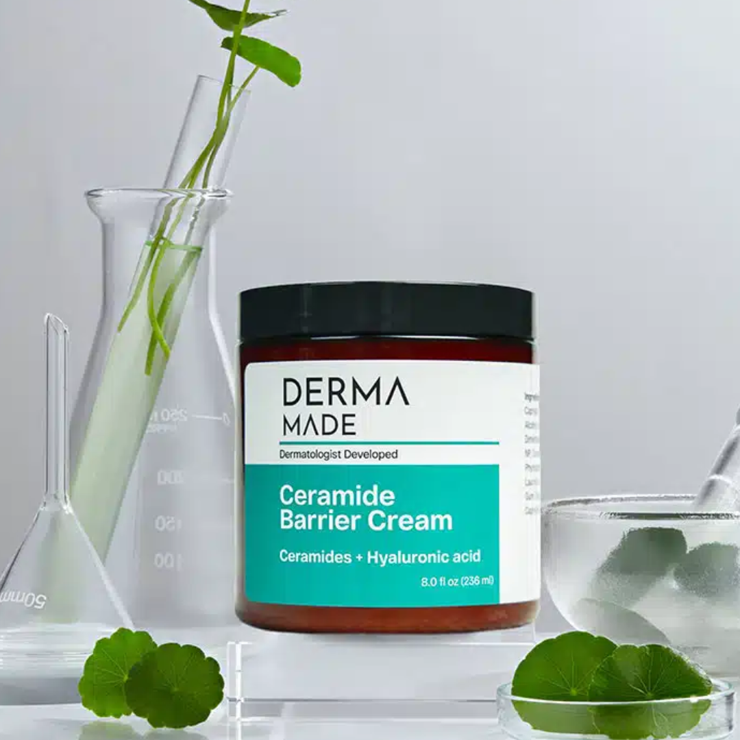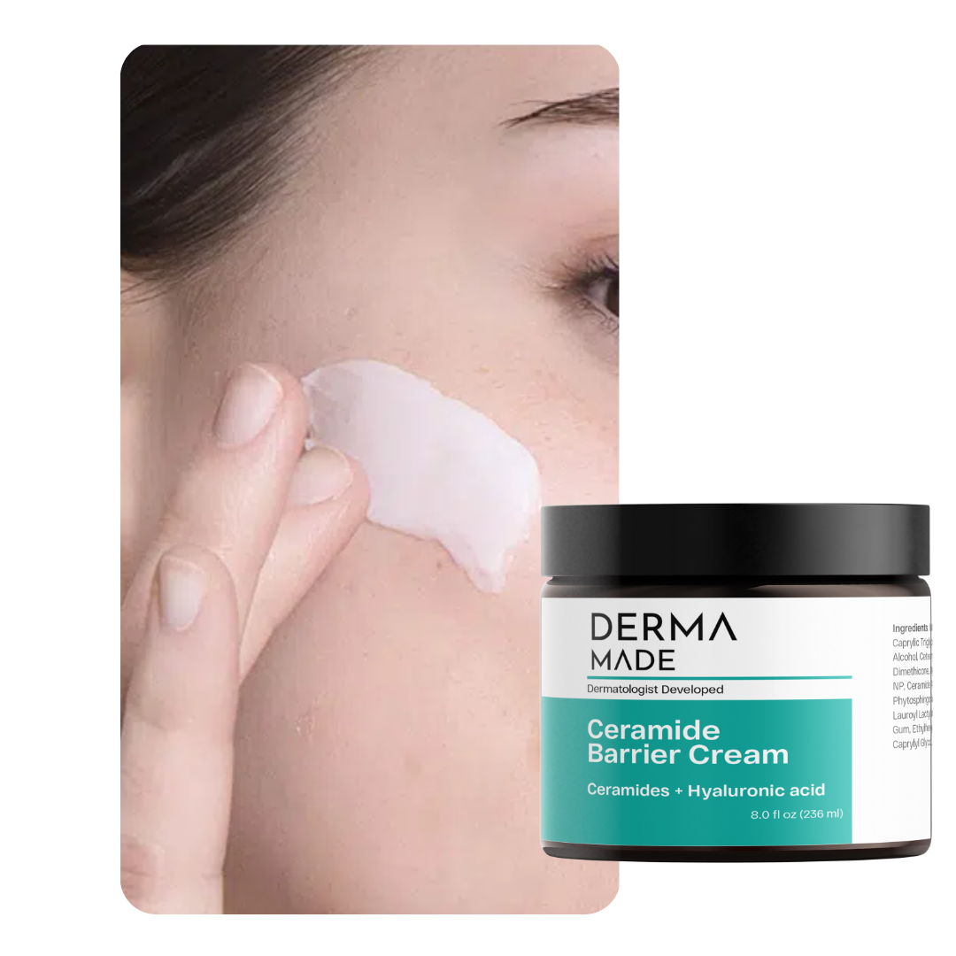 Derma Made's Ceramide Barrier Cream (8 fl oz) is a rich, ultra-hydrating cream with ceramides and hyaluronic acid to deeply moisturize. The cream creates a barrier on your skin to protect it from outside elements, and to retain the moisture inside so the skin looks and feels plump.