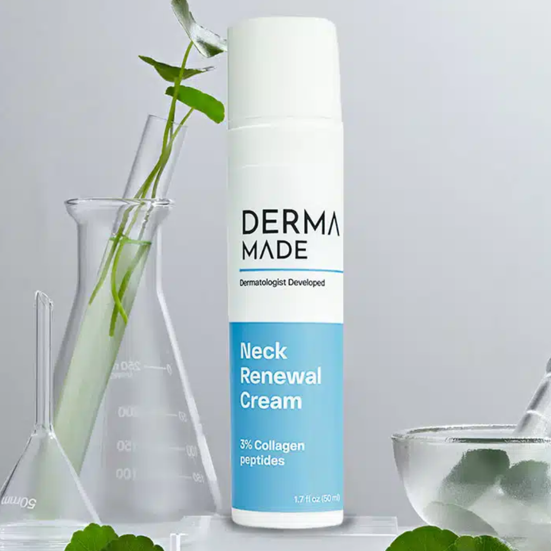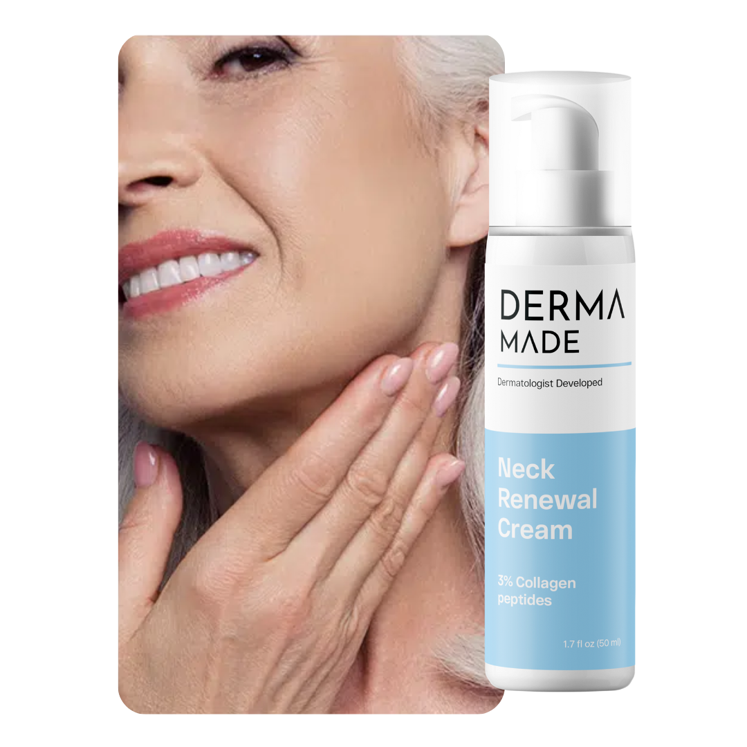 Derma Made's Neck Renewal Cream (1.7 fl oz) is designed specifically for the neck where the skin is much thinner. This rich cream with collagen peptides improves saggy skin and supports collagen to improve skin elasticity.